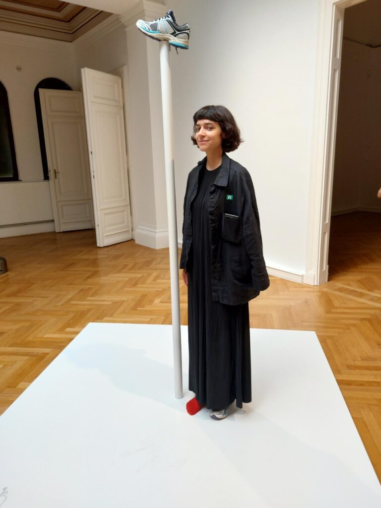 Anneleen Swillen (onderzoeker PXL/UHasselt-MAD-Research) als one minute sculpture van Erwin Wurm Francisco Carolinum Linz (september 2025).