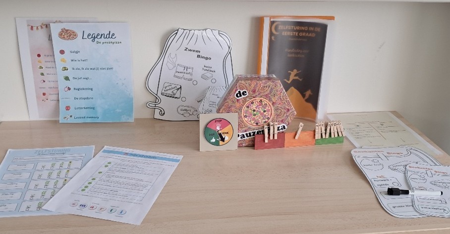 Om de leerkracht écht in haar kracht te laten staan, ontwikkelde ik een toolbox. Deze doos bevat acht materialen die zowel zijzelf als de kinderen kunnen inzetten om stapsgewijs tot zelfsturing te komen. Daarnaast werkte ik een handleiding uit met een uitleg van complexe begrippen, de meerwaarde van elke tool en tips om als leerkracht je gedrag aan te passen aan het niveau van de klas. De materialen zijn bruikbaar in de eerste graad van het basisonderwijs, maar kunnen mits aanpassingen gebruikt worden in hogere leerjaren.
