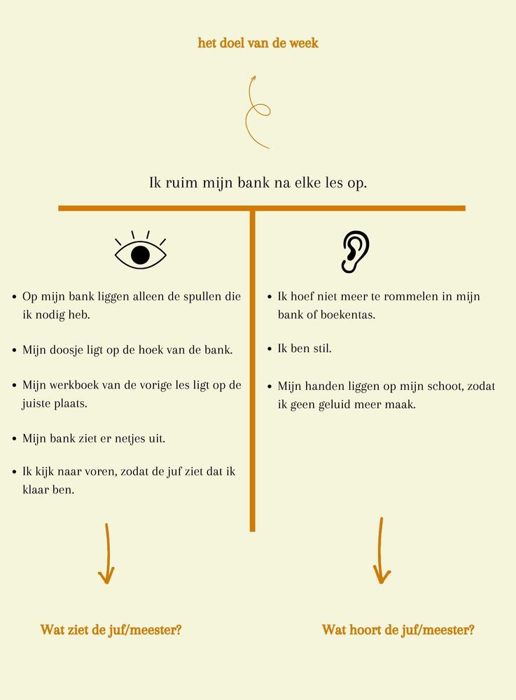 De leerlingen bestuderen onbewust een rolmodel: de leerkracht. Scaffolding blijft dan ook belangrijk, oftewel tijdelijke en aanpasbare steun, zodat elke leerling afzonderlijk uitgedaagd wordt. Om die reden schreef ik in de handleiding hoe de leerkracht in elke fase van zelfsturing het beste kan handelen, bijvoorbeeld wanneer de kinderen meer losgelaten kunnen worden. Daarnaast gaf ik tips om het leerproces op een aangename manier te bevorderen. Ter illustratie: het is handig om onmiddellijk te werken met het T-diagram wanneer de klas voor het eerst een weekdoel opstelt. De leerkracht schrijft bovenaan het doel waaraan gewerkt wordt. Vervolgens verduidelijken de leerlingen hoe je kan zien en horen wanneer dit weekdoel bereikt zal zijn. Zo blijft iedereen op dezelfde golflengte.