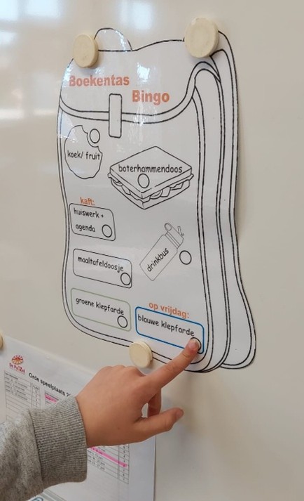 De tweede prijs ging naar de Boekentas Bingo, een ludieke checklist om na te gaan of de boekentas compleet is alvorens naar huis te vertrekken. De tool bestaat uit een silhouet van een boekentas. Daarin staan figuren, zoals een drinkbus en maaltafeldoosje, zodat de leerlingen stapsgewijs kunnen controleren of ze niets vergeten zijn. Met een uitwisbare stift kleuren ze het bolletje naast het voorwerp in, als deze in hun boekentas zit. Zo leren de kinderen om georganiseerd te werken. Ook de variant, de Zwem Bingo, deed goed zijn werk.